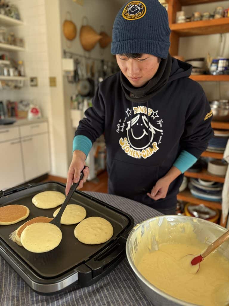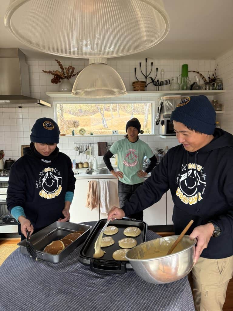 今年は、キャンプ前にリュウノスケ、タクマがそれぞれお手伝いに来てくれて、昨日からエイタロウが前入りして最終準備を終え、今日は午前中にヒロマサが到着し、みんなのおかげでスムーズに進み、パンケーキはヒロマサとえいたろにお任せしました。料理男子はモテますからね。しっかり伝授させていただきました。レシピはもちろん檀さんの3719パンケーキレシピです!
