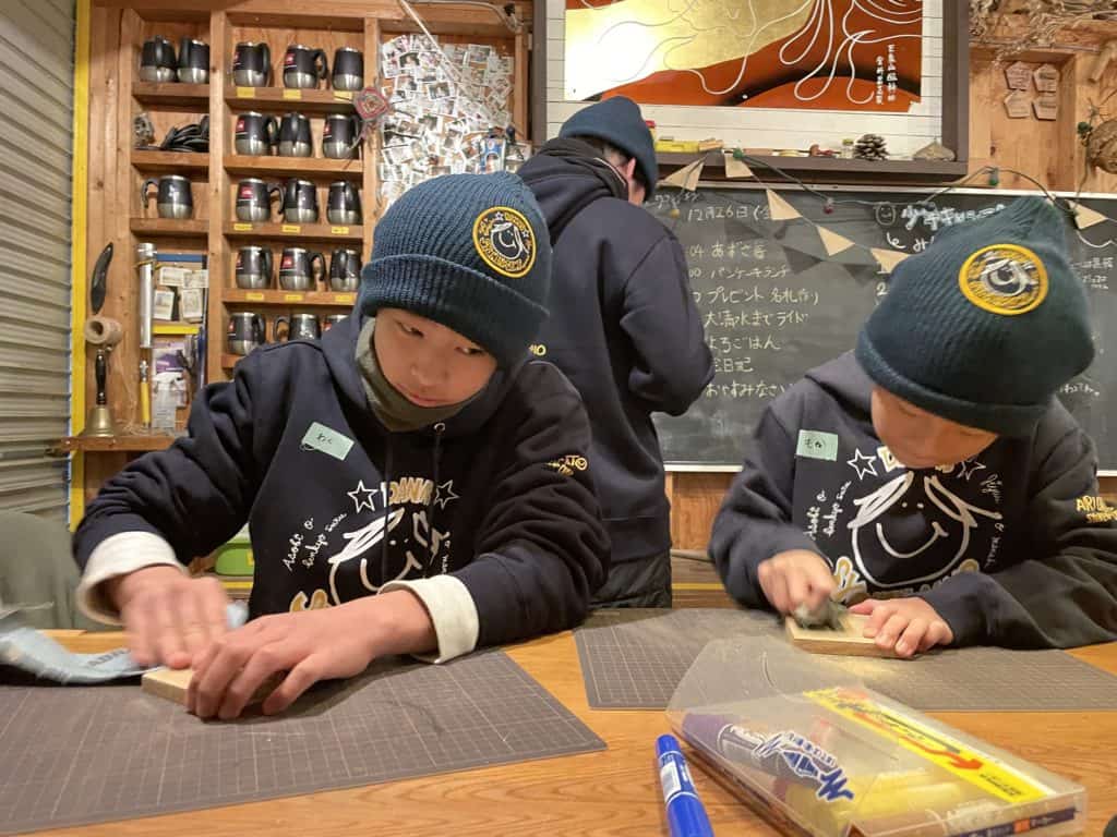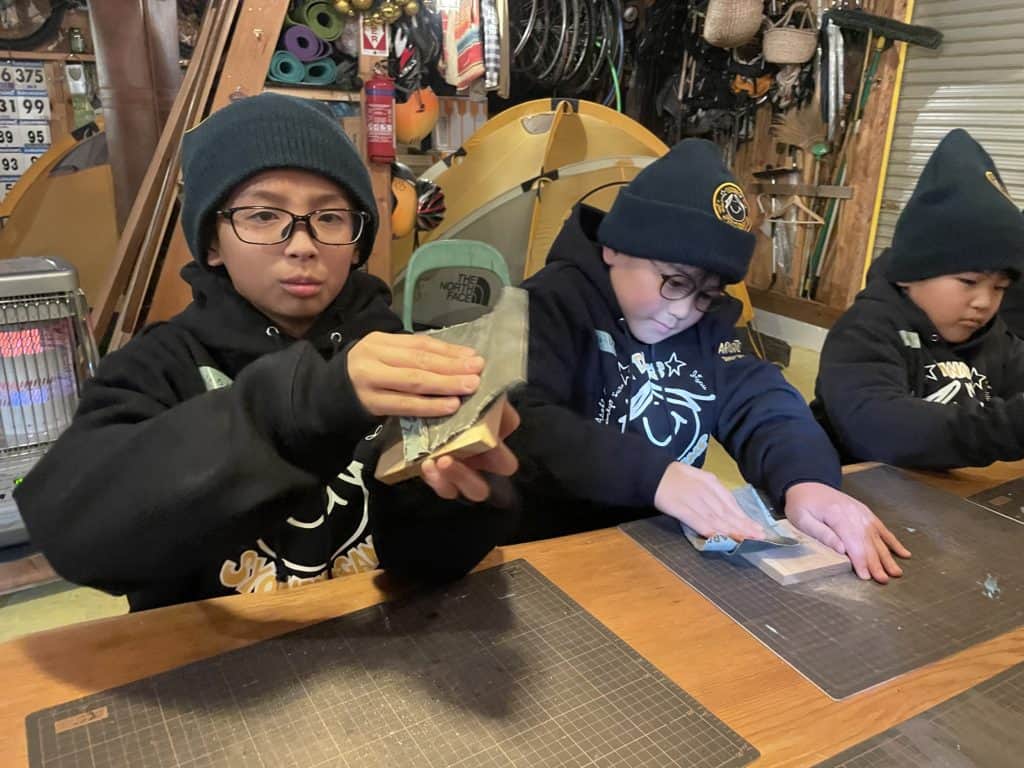 最初のワークショップは、MTBに付ける名札作りから。彼女募集中のユウシン(笑)